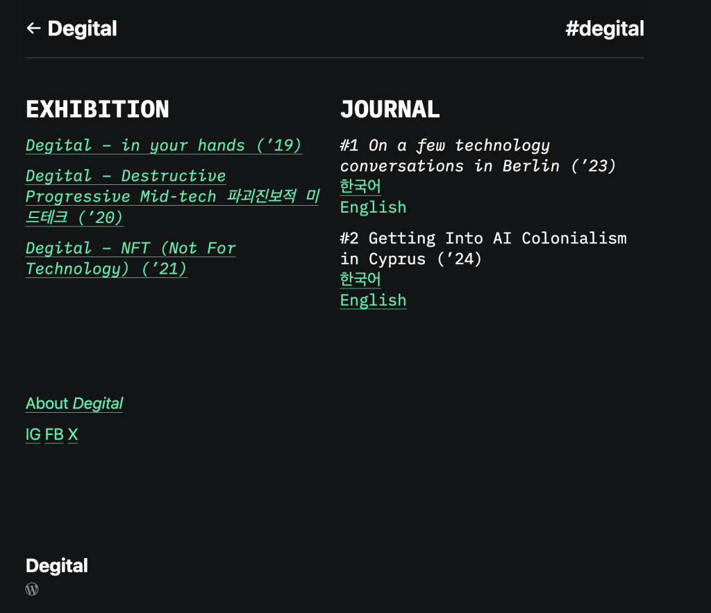 Degital is an exhibition/journal platform that does not see technology as a tool but as an artistic experiment that can expand our present thinking process. Degital seeks alternative forms of art that deal with digital technology. Degital is a purposely wrong spelling of ‘digital’, coined to perform multiple roles, such as expanding the idea of digital arts, suggesting the alternative, being playful, and suggesting interesting line-ups of artworks. This method is also borrowed from a feministic approach where they intentionally change the spelling to suggest a new perspective (woman/womyn), and we aim to raise awareness of diversity issues (gender, education, etc) in both digital and media arts. The word ‘digital’ originates from the Latin word ‘digit,’meaning a finger used to count numbers in order, and ‘digital’ means dealing with discrete values. However ‘degital’ is coined from the prefix ‘de-’, which means denying, absence, and rejection, yet maintains a similar pronunciation.