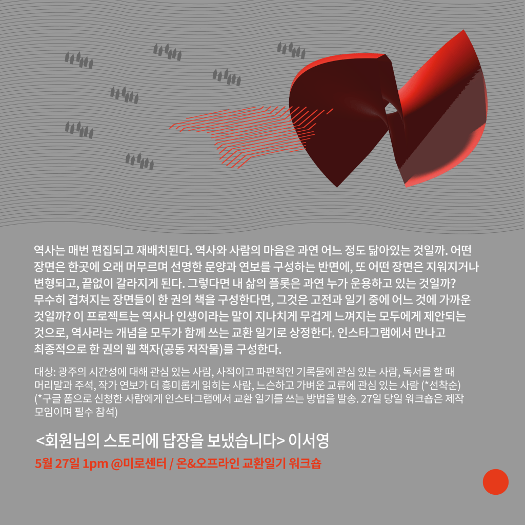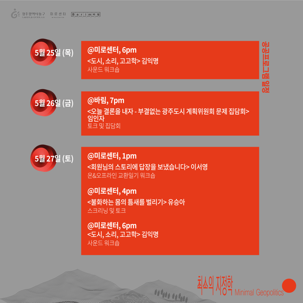 (3) 제로의 거리: 광주와 서울, 온라인과 오프라인에서 열리는 시도를 통해, 지역 간의 물리적 거리, 유형적으로 발현되는 위계적 공공성을 전복시킬 수 있는 실험, 실천을 제안합니다.Zero Makes Zero, a public art project selected by Arts Council Korea in 2020, is a forum that examines the structure of the art scene and elevates a diverse array of voices. It captures the movements and actions of creators, citizens, and activists across systems and genres, learning about their attitudes and imagining the relocation of the meaning of public art.