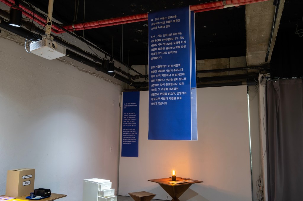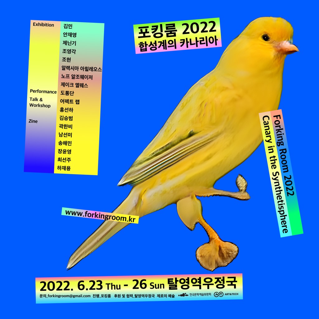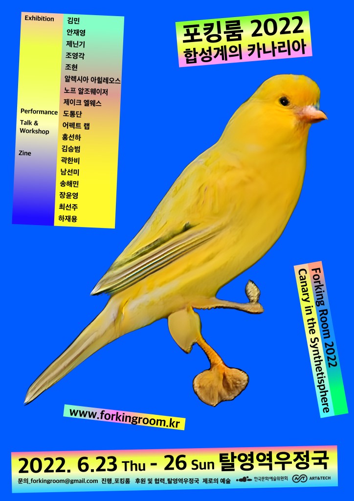 In 2022, Forkingroom addressed stories of the Synthetisphere that alternates between virtual and synthetic. Synthetics indicate images, sounds, or texts, the results that are not directly extracted from actual phenomena or events but generated from calculations. The Synthetisphere signifies the technological-social phenomena and mechanisms in which such results function efficiently and significantly to loosen the cognitive system of human beings. When the synthetic elements of the Synthetisphere exhibit incredible efficiency going beyond actual reality, it can be called ‘the canary in the Synthetisphere.’ We entered the Synthetisphere as a being like a canary in a mine of bits.