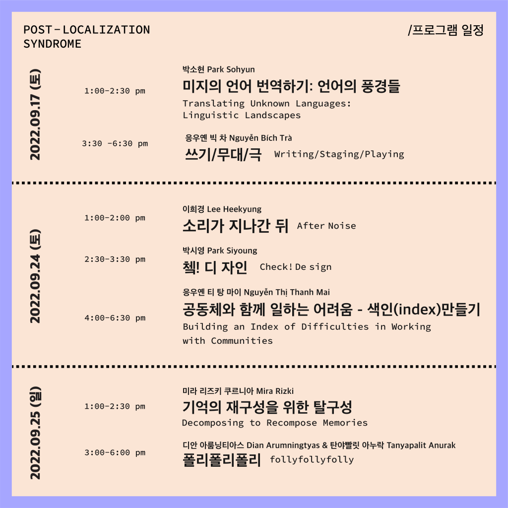 http://semacoral.org/features/unmakelab-minhyeongkang-forkingroom-conversationPost-localization Syndrome (2022) 서울미디어시티비엔날레 프리 프로그램, 서울시립미술관 (Dir. Rachael Rakes)